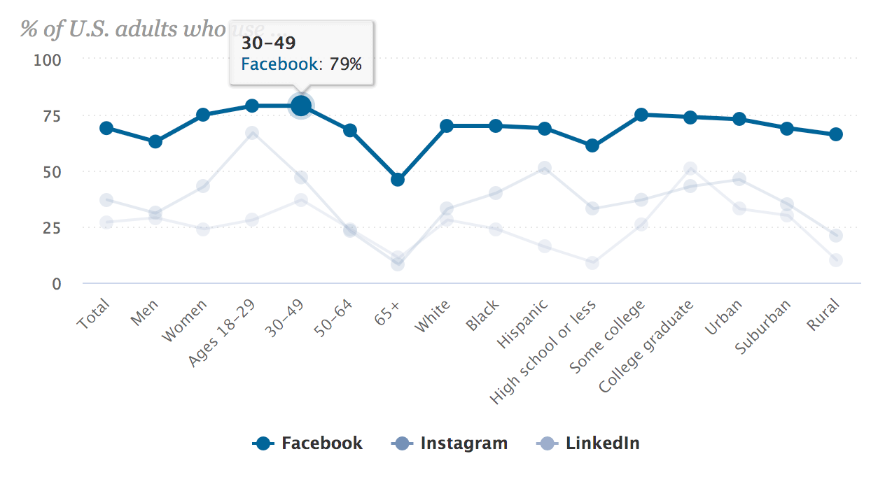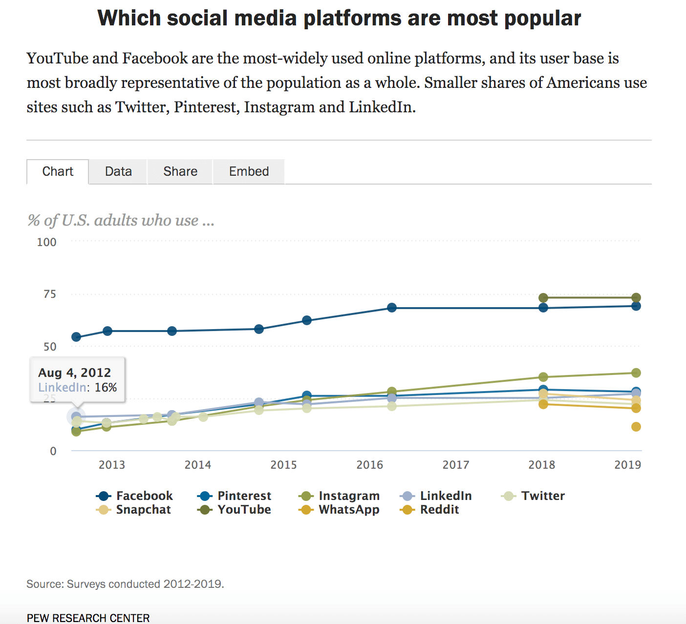 In the United States, the Pew Internet Social media fact sheet is a good source showing trends in usage. It shows a similar pattern to the Kepios data, with Facebook and YouTube dominant, but also includes LinkedIn, which as a network for business professionals is used by around one-quarter of the US population.