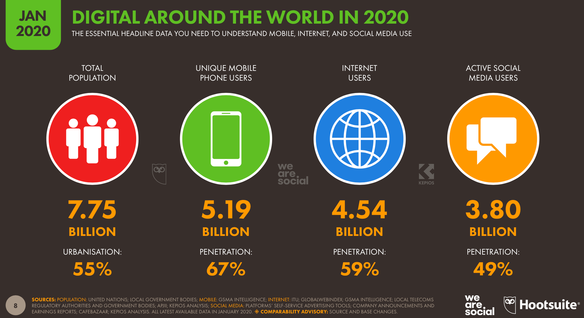 Some of the key takeaways from their Digital 2020 Global digital overview published on the 30th January 2020 are:
