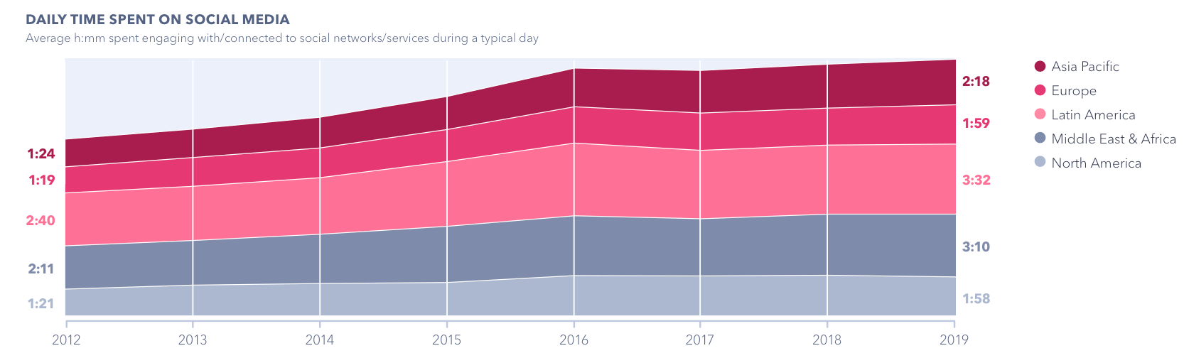 Overall, digital consumers are now spending an average of 2 hours and 24 minutes per day on social networks and messaging apps according to Global Web Index.
