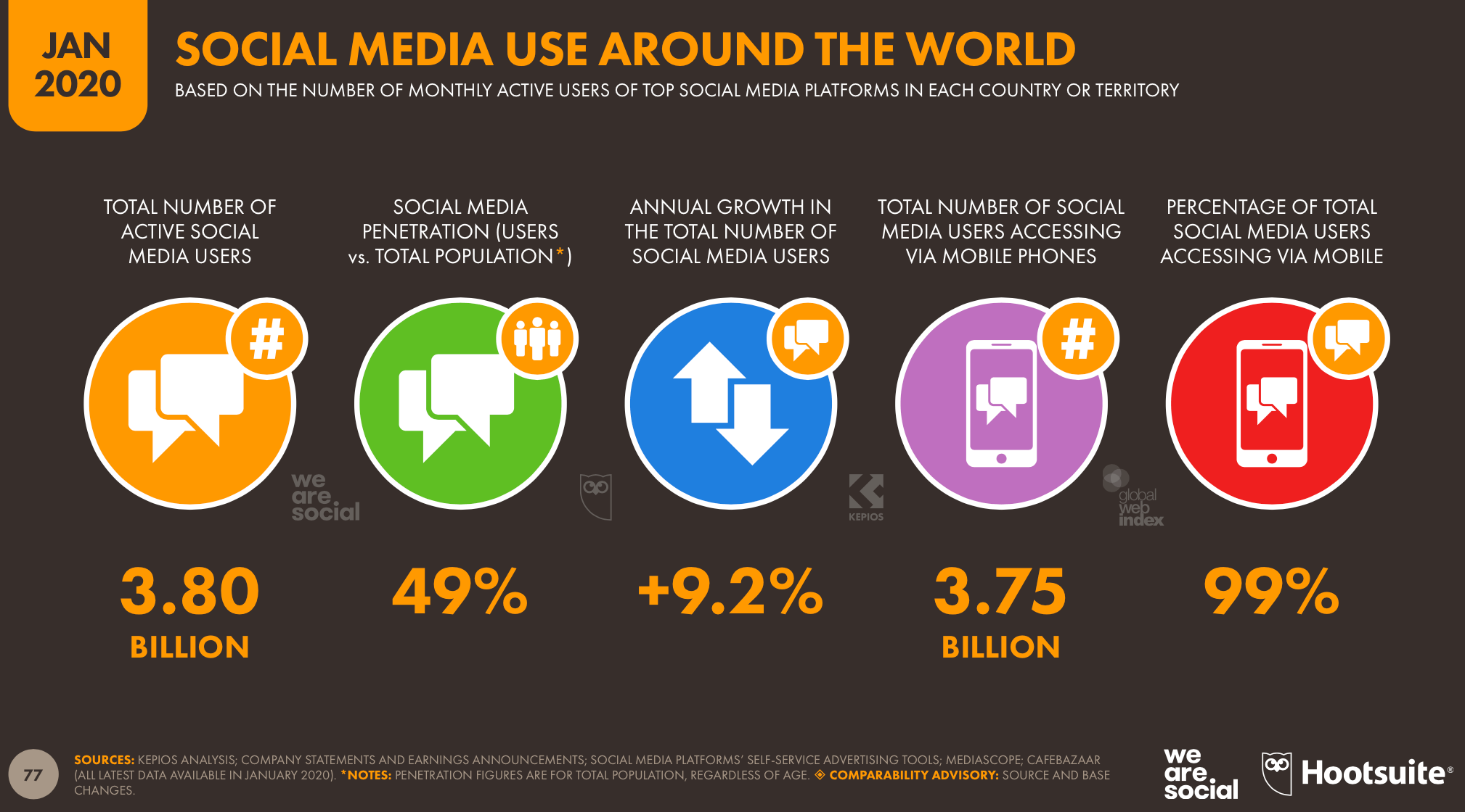 Social networks have transformed marketing and, as this post shows, their popularity is still growing in our latest global social media statistics research summary for 2020 . Networks vary in popularity with different demographics and they’re still evolving. Research by Global WebIndex that we reference in this article shows that globally,